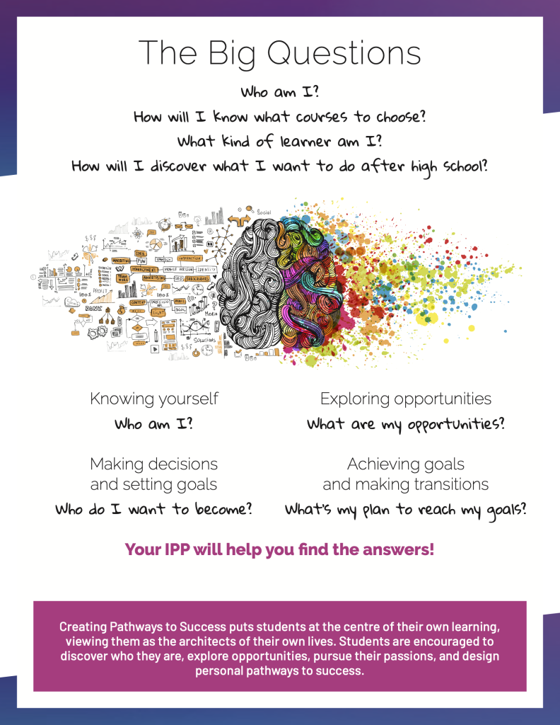 Students document and regularly review their learning in education, career and life planning in their Individual Pathways Plan (IPP) in myBlueprint. Using this web-based tool, students draft their future, increasing awareness of their personal strengths and interests and related opportunities for learning (secondary courses or postsecondary opportunities) and work. The development of the IPP helps students take responsibility for their learning and planning for their future.